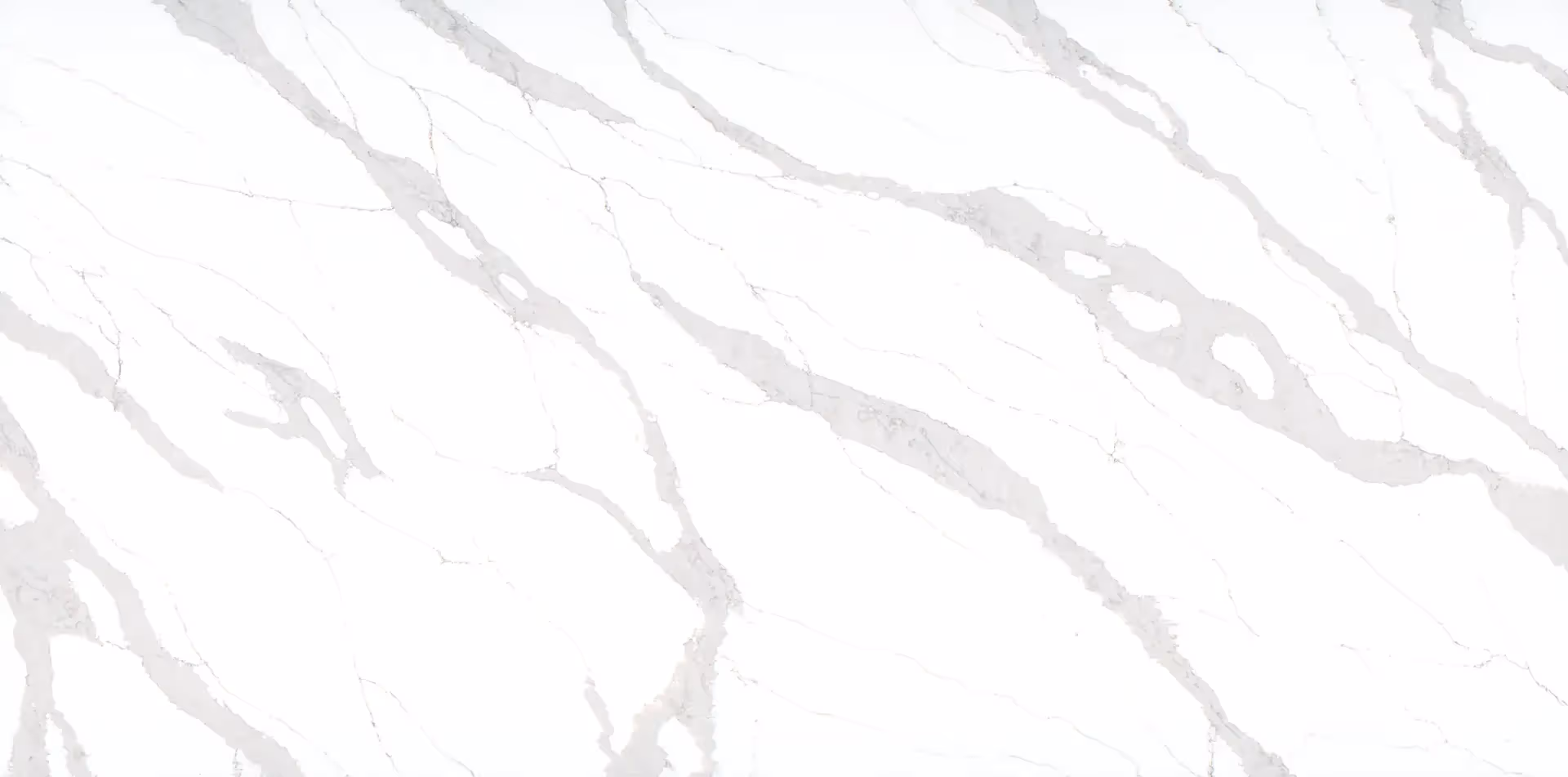 CALACATTA FORTE BQS presents a clean white engineered quartz surface accentuated by bold dark veining patterns. This premium quartz�worktop combines silicon quartz components with polyester resin technology�for exceptional strength and beauty.