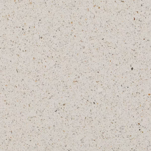 This quartz agglomerate slab has a medium grain and variable color, offering warm chromatic areas blending from beige to ochre. This texture was popular in mid-20th century residential buildings and has been updated by Quartzforms�.