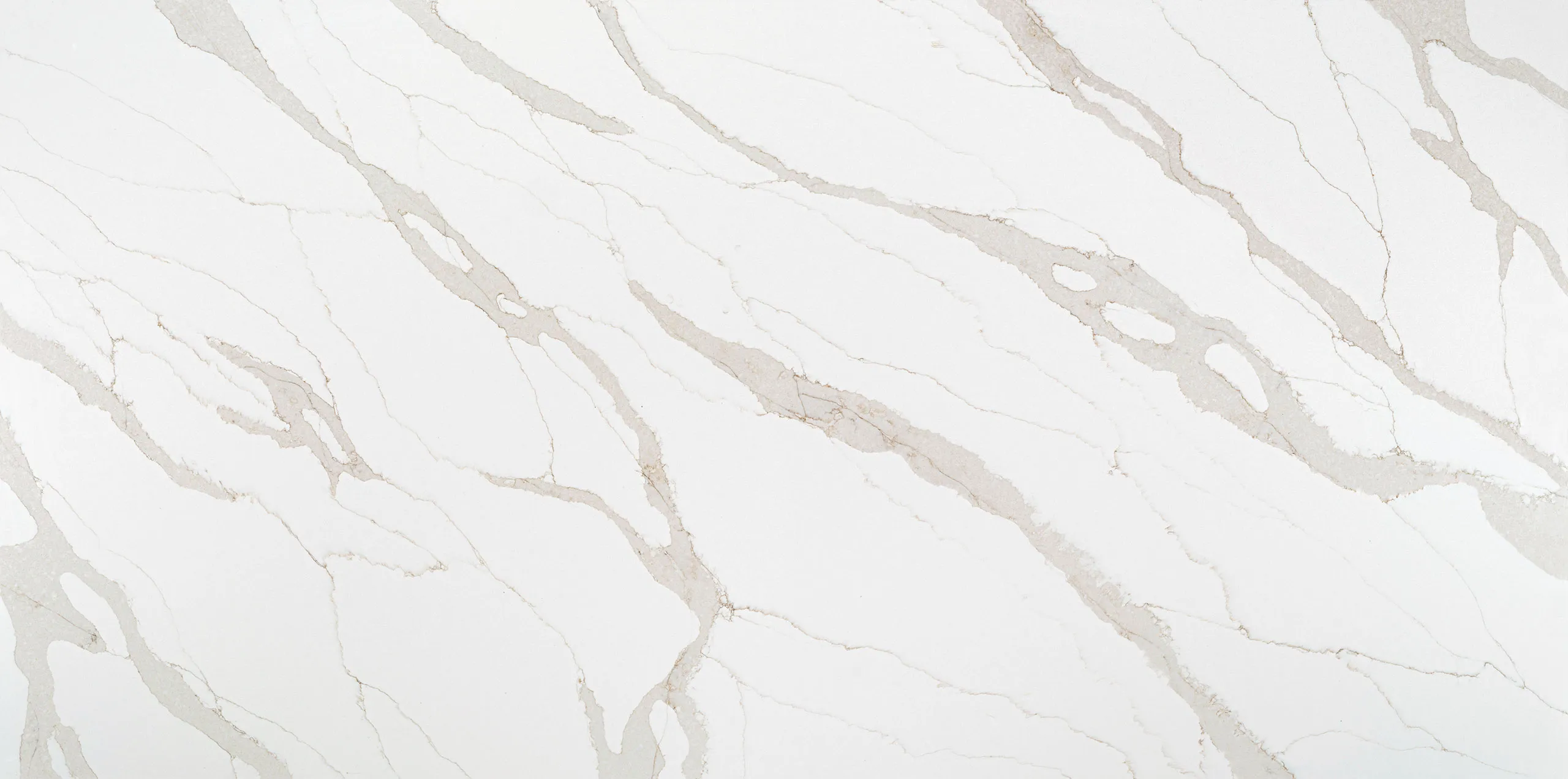 Calacatta marble-inspired quartz, featuring a white background with bold, dynamic gold and grey veining