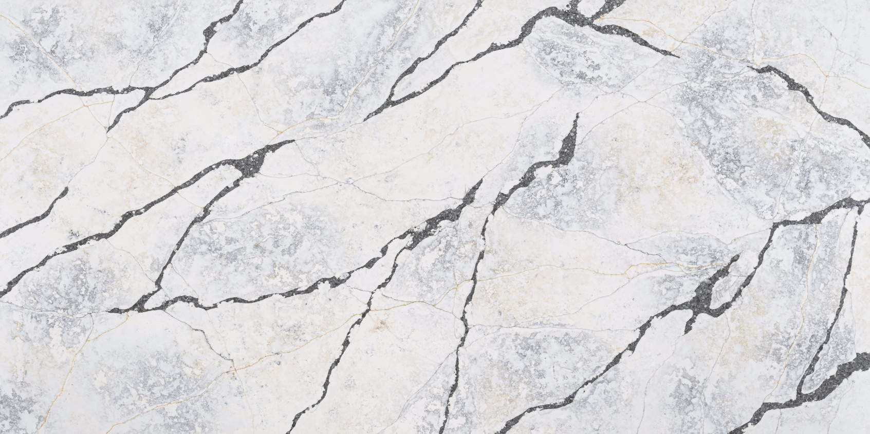 Ijen Blue quartzite-inspired quartz, featuring an off-white, blue-grey and brown background with dynamic blue-grey and rust veining